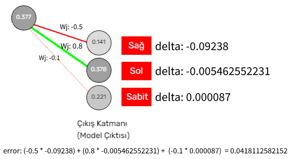 Bu örnekte oynanması gereken kabiliyet veri setine göre 'Sağ Oynama' kabiliyeti, bu yüzden geriye besleme algoritmasında 'Sağ Oynama' kabiliyetini temsil eden nöronumuzu buna benzer girdilerde 1'e yaklaştırmak, diğer iki nöronumuzu 0'a yaklaştırmak istiyoruz.